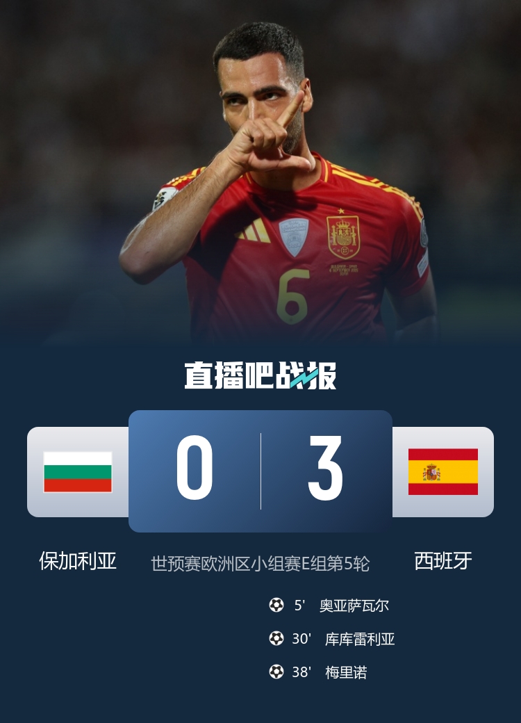 世预赛:西班牙3-0轻取保加利亚,梅里诺、库库雷利亚分别破门,亚马尔献助攻