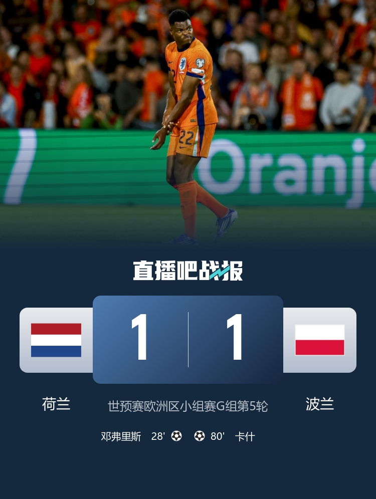荷兰1-1平波兰两队同积7分,邓弗里斯头槌破门,卡什80分钟扳平比分