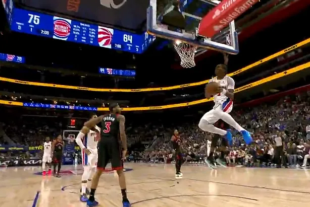 奥萨尔飞身大拉杆上反篮打进,活塞下半场领先猛龙13分